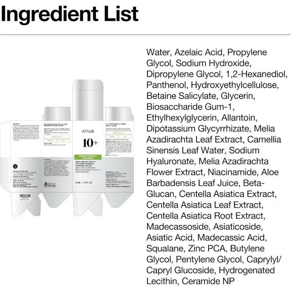 Water, Azelaic Acid, Propylene Glycol, Sodium Hydroxide, Dipropylene Glycol, 1,2-Hexanediol, Panthenol, Hydroxyethylcellulose, Betaine Salicylate, Glycerin, Biosaccharide Gum-1, Ethylhexylglycerin, Allantoin, Dipotassium Glycyrrhizate, Melia Azadirachta Leaf Extract, Camellia Sinensis Leaf Water, Sodium Hyaluronate, Melia Azadirachta Flower Extract, Niacinamide, Aloe Barbadensis Leaf Juice, Beta-Glucan, Centella Asiatica Extract, Centella Asiatica Leaf Extract, Centella Asiatica Root Extract, Madecassoside, Asiaticoside, Asiatic Acid, Madecassic Acid, Squalane Zinc Pca, Butylene Glycol, Pentylene Glycol, Caprylyl/Capryl Glucoside, Hydrogenated Lecithin, Ceramide NP