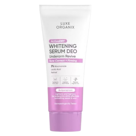 Luxe Organix ActiveDRY Whitening Serum Deo Underarm Revive is a lightweight deodorant with 3% Niacinamide, Copper Peptide, and Retinol that helps tighten, smooth, and improve underarm elasticity. It offers long-lasting sweat and odor protection, keeping you fresh, smooth, and confident all day.