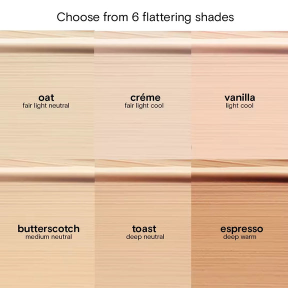 Available in six ultra-flattering shades - oat, creme, vanilla, butterscotch, toast, espresso
