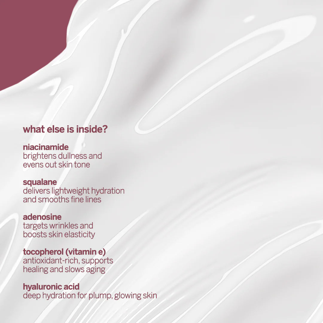 This product features a blend of key ingredients designed to nourish and improve the skin. Niacinamide helps brighten the skin tone and address visible signs of aging and uneven texture. Centella Asiatica soothes and calms irritated skin while promoting healing. Squalane delivers lightweight moisture without clogging pores and helps reduce the appearance of fine lines and wrinkles. Adenosine works to visibly improve the appearance of wrinkles, while Tocopherol (Vitamin E) provides antioxidant protection, strengthens the skin barrier, and supports anti-aging. Lastly, Hyaluronic Acid helps lock in moisture and deeply hydrate the skin.